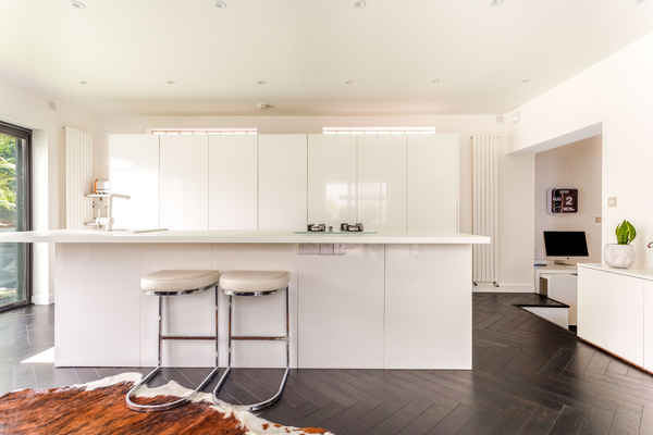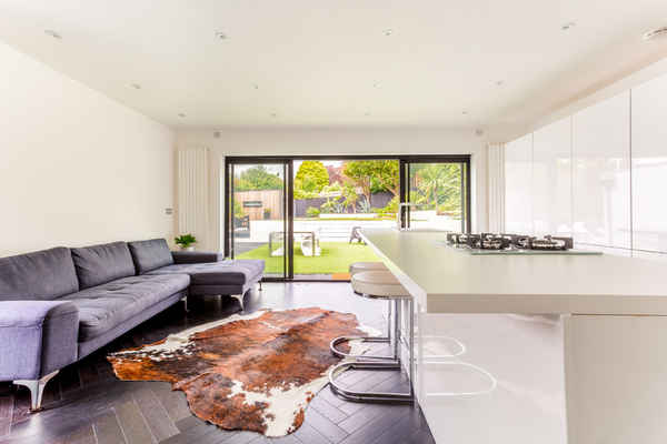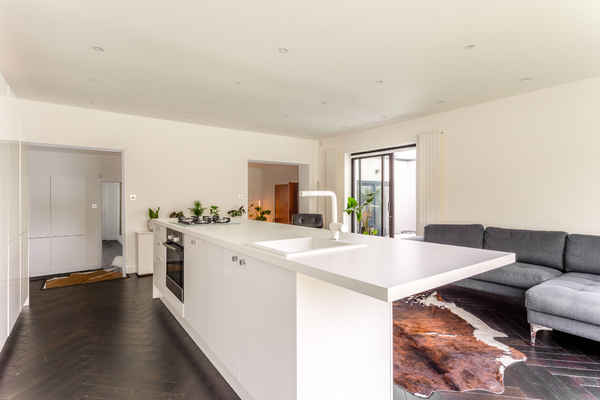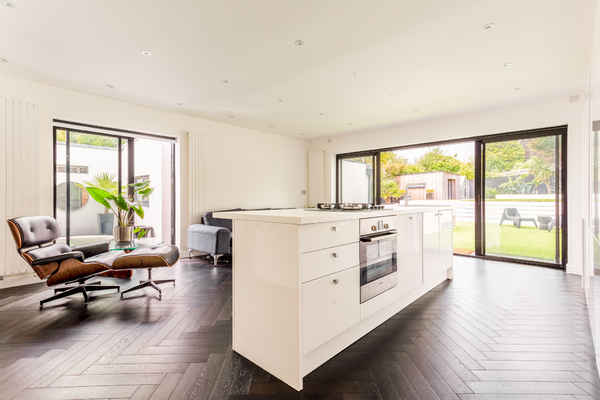 The modern white kitchen with island has floor to ceiling sliding doors, maximising natural light.