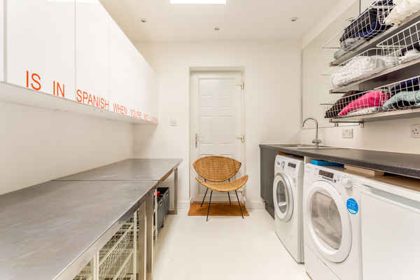 Multiple stylish lounging areas, office space and utility room.