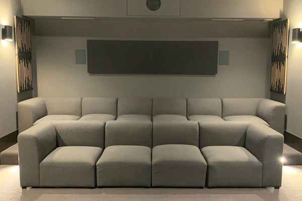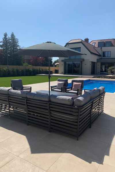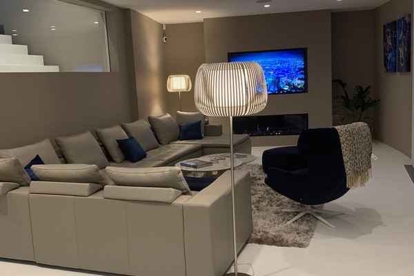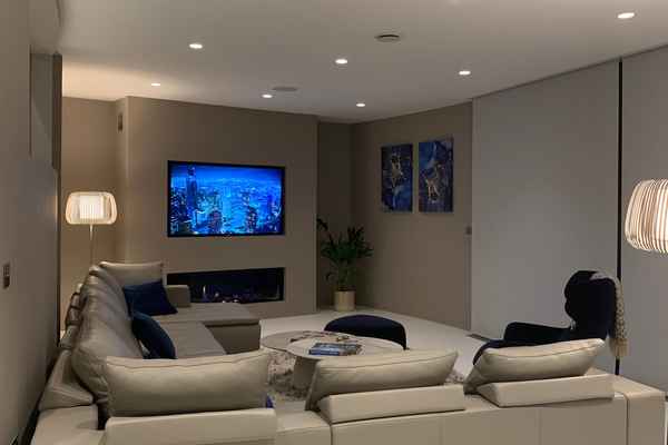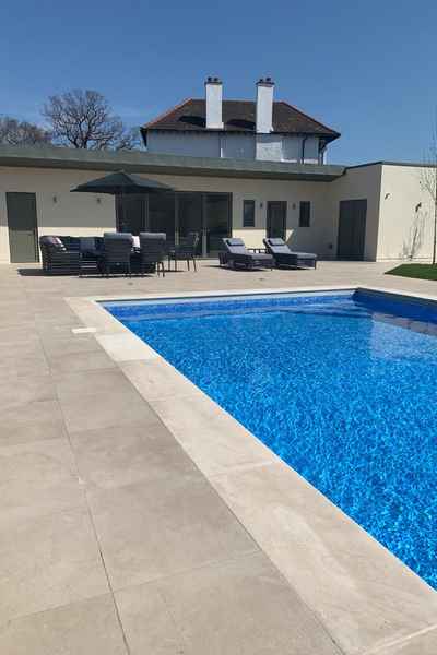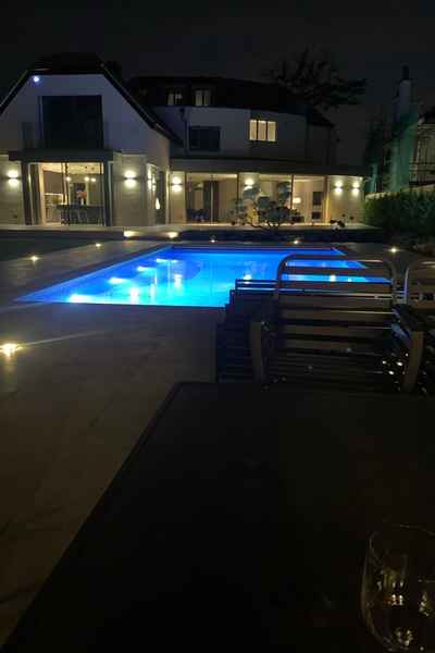 This stunning modern house features luxury through-out including a swimming pool and cinema room .