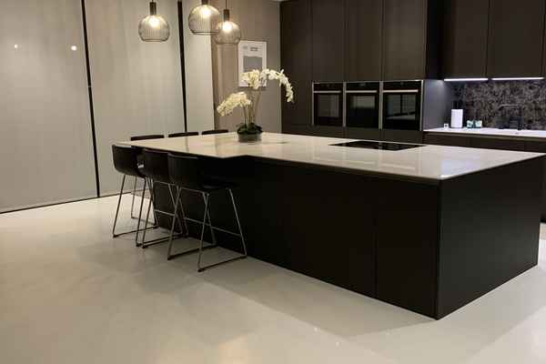 The kitchen is large and features an extra large island with seating space and hanging lights.