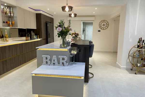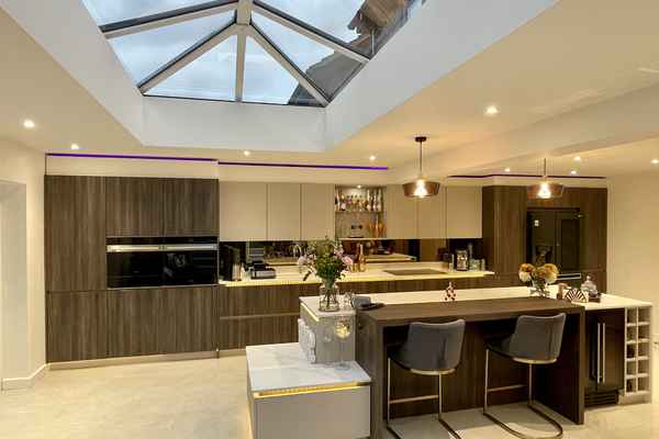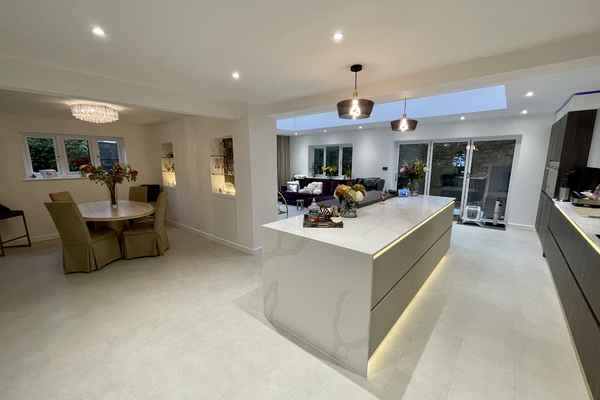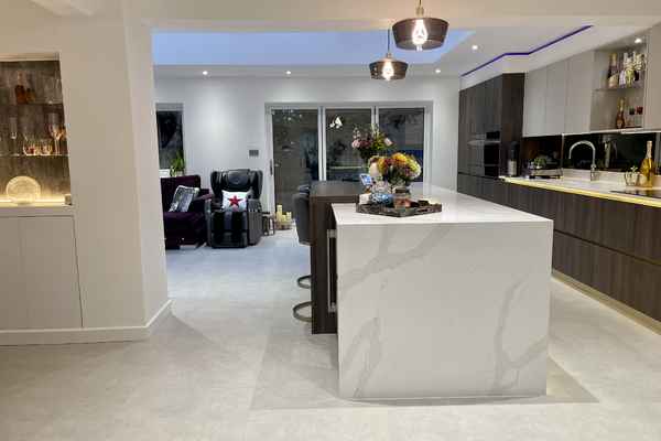 There is a large open plan kitchen and living space with kitchen island featuring marble look work surface.
