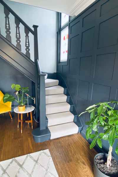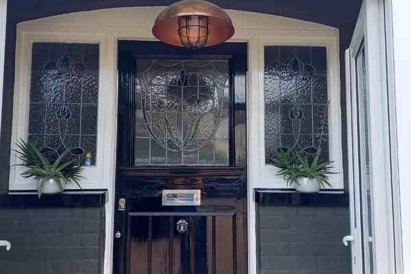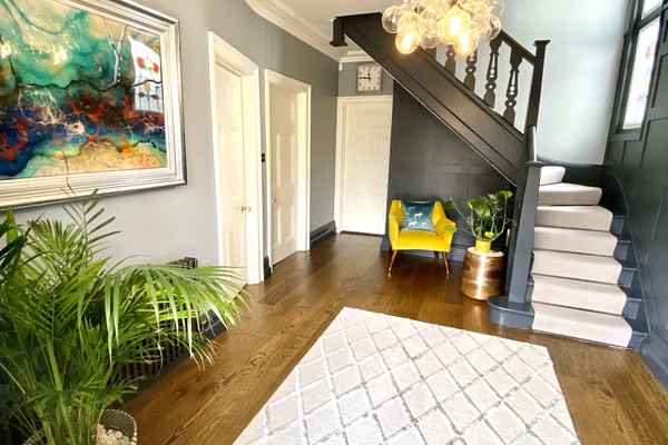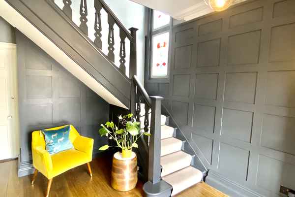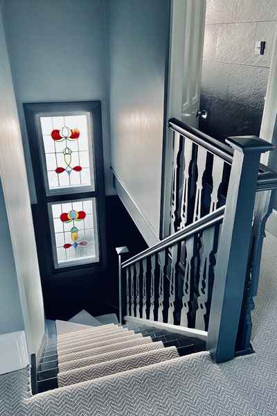 Upon entry to the house is a good sized entrance hall and stylish staircase with carpet runner and stained glass window.