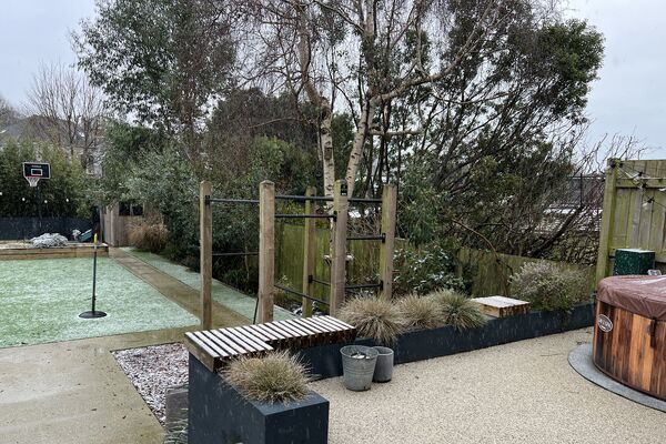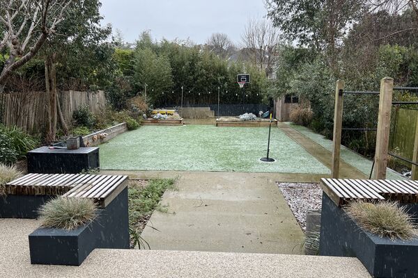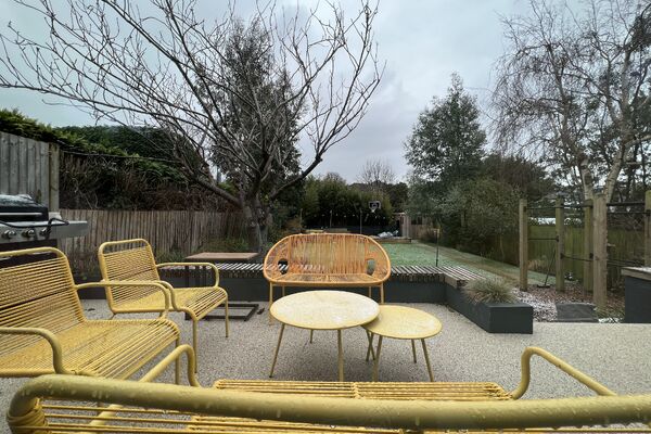Very large, landscaped garden suitable for year round filming having two large terraces, mature planting and a large artificial grass lawn. Large open plan living and dining area opens onto the garden through 8 metre sliding doors. This room has high ceilings which have 3 exposed steel beams and a plywood ceiling. This space is bright, light, and open in feeling, full of statement furniture and colour. This living space is divided from the rest of the ground floor by a large plywood sliding door which has a striking cut out mid-century modern design.