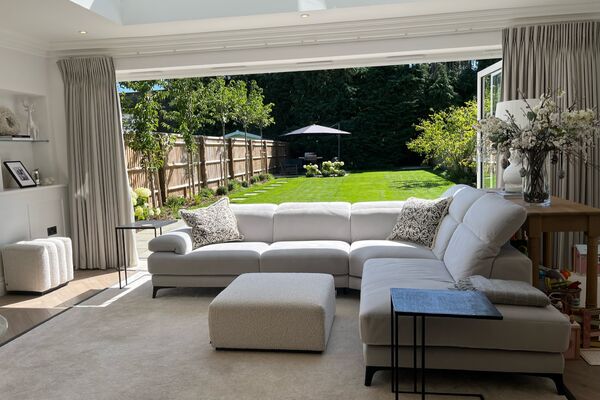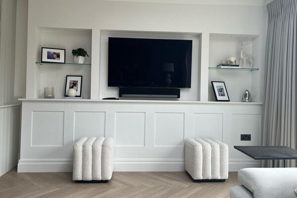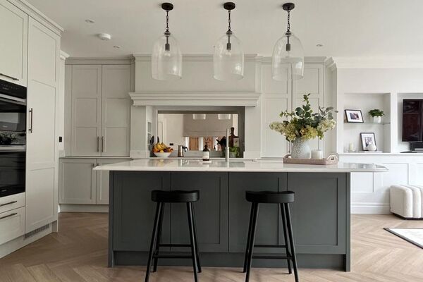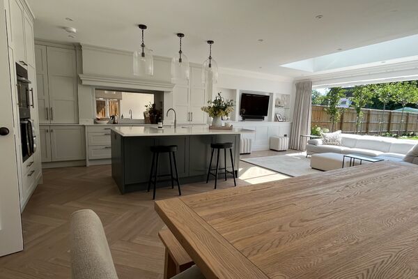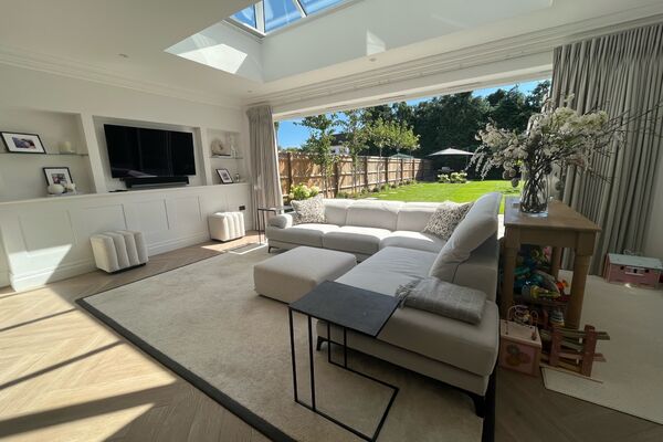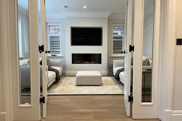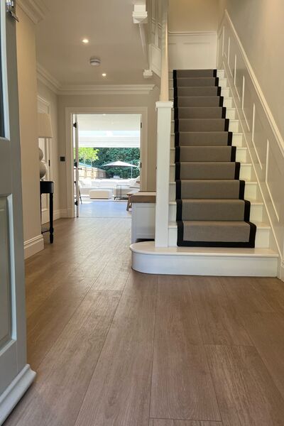 Ground floor – Entrance Hallway with wooden plank floor tiles. Double doors leading to open plan kitchen with dining and lounge area to the rear of the house, overlooking the garden. Large kitchen island, with brass fittings and a quooker tap in a large double Belfast Shaws sink. Large dining area, seating 12 people and zoned lounge area with TV wall and bespoke rug with tape edge binding, and play area with a large lantern roof. Herringbone wooden floor tiles are laid in the kitchen. Double doors leading to a separate lounge with TV wall and in built electric fire and bespoke rug with tape edge binding at the front of the house. Cloakroom toilet and utility. Cornicing throughout.