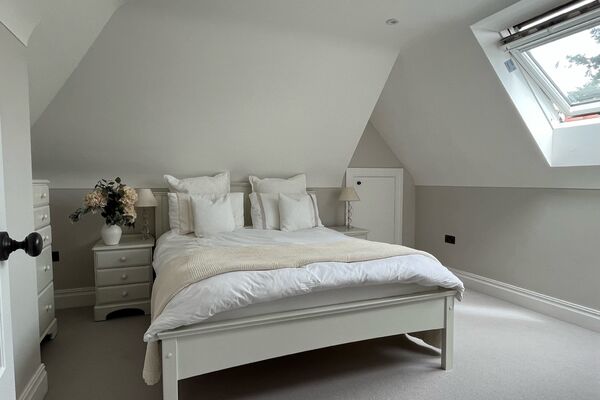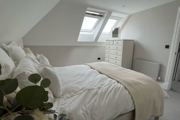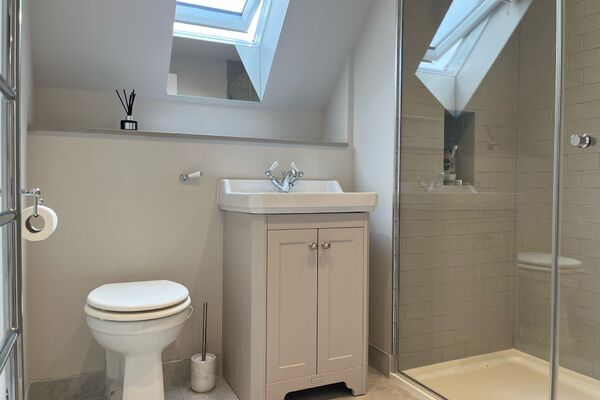 Second floor: Two double bedrooms in neutral décor and a bathroom, with a shower.