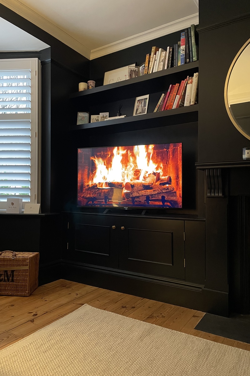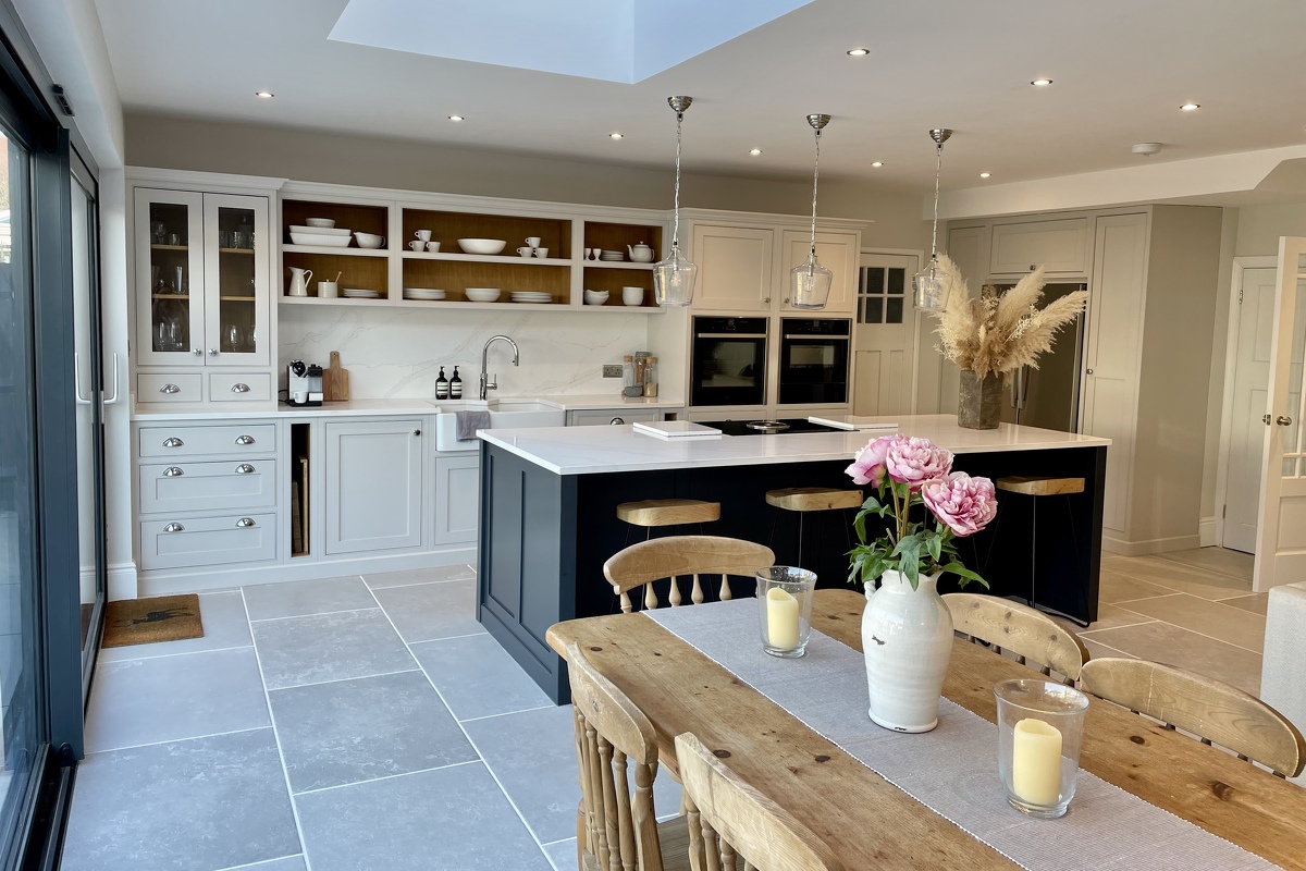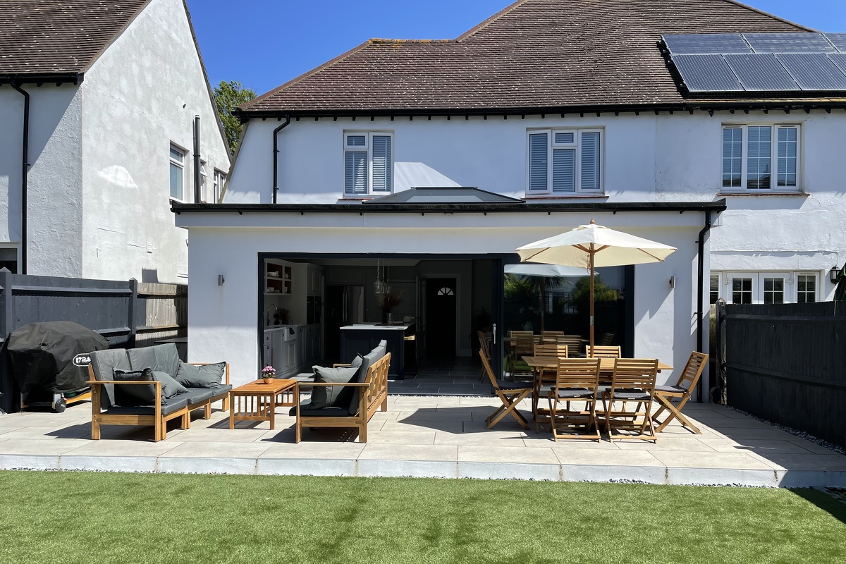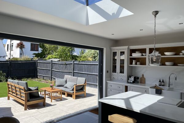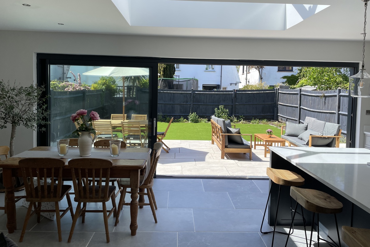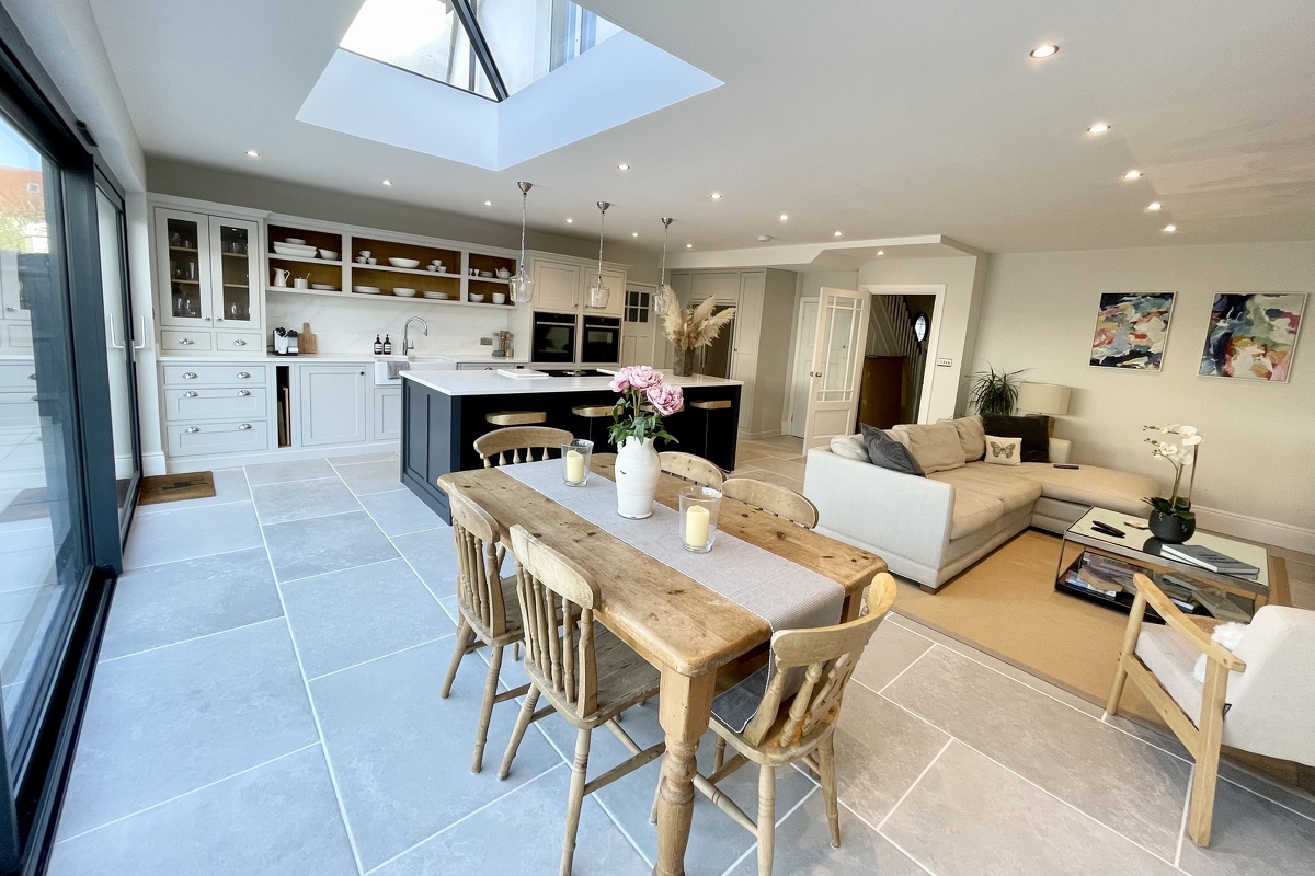 An open plan kitchen/dining/living room with glass doors leading to the garden plus a separate dark ‘snug’ front lounge.