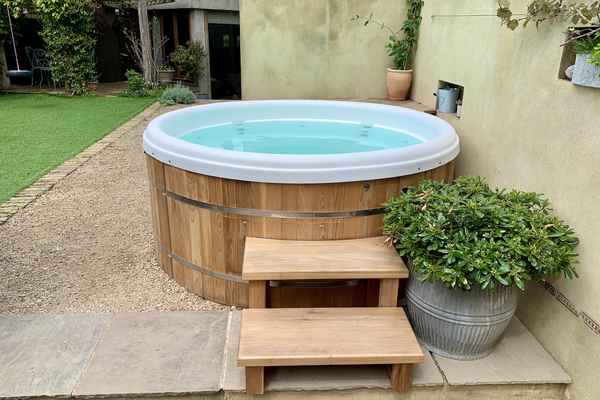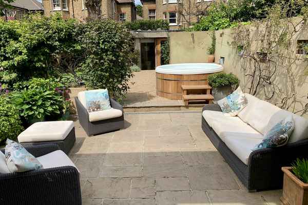 Leading out from the kitchen is a good sized back garden which has an oak hot tub, faux grass and outdoor seating/dining space.