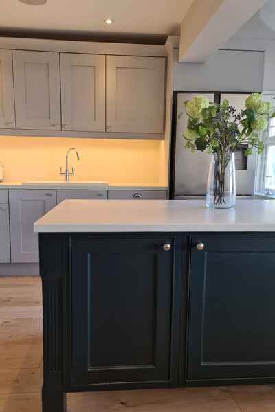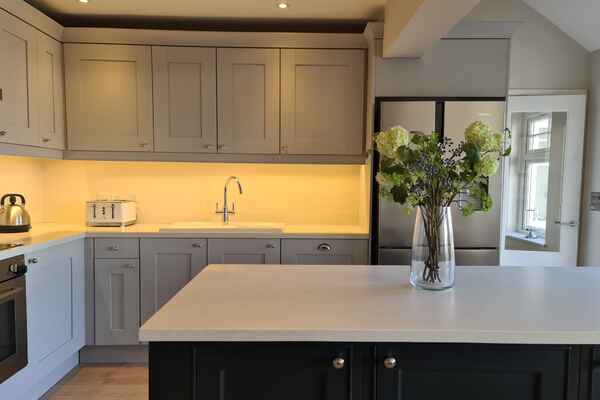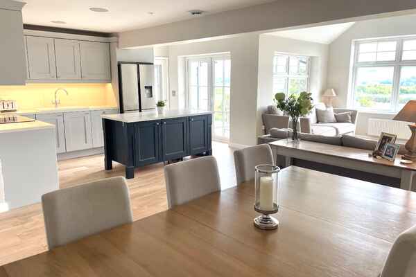 There is an open plan living and kitchen space in a shaker style with centred island.