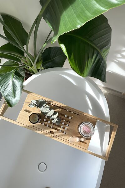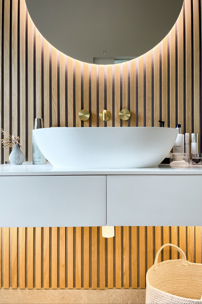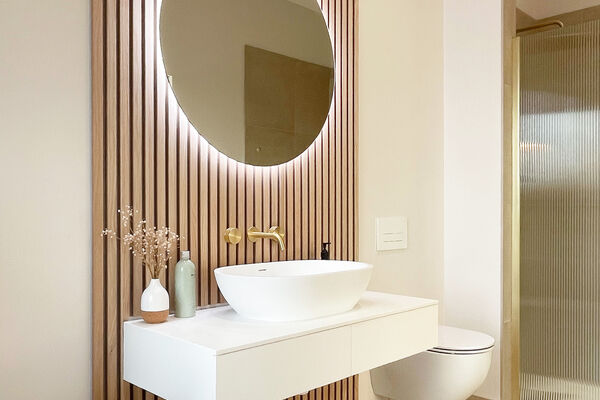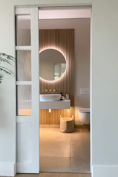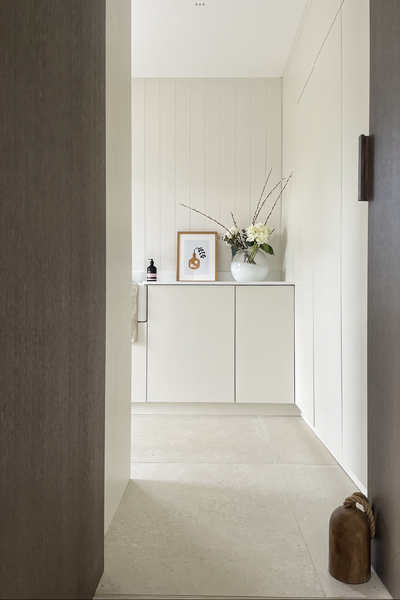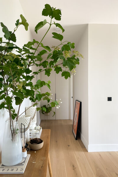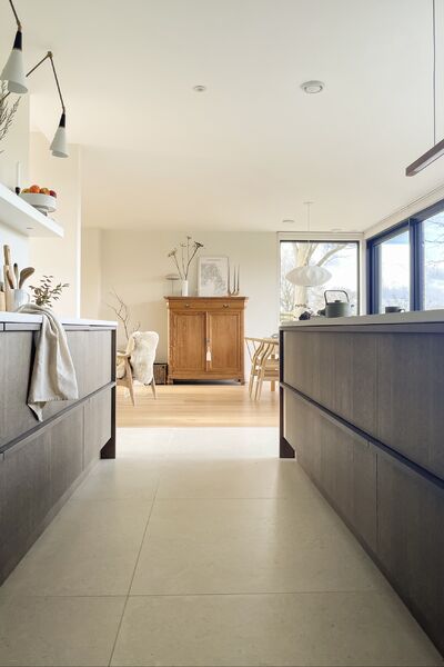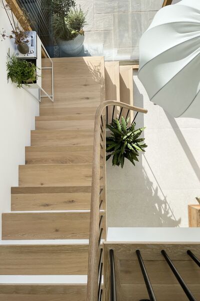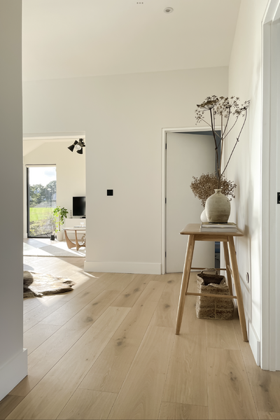 Light engineered oak wood flooring mixed with natural porcelain tiles.