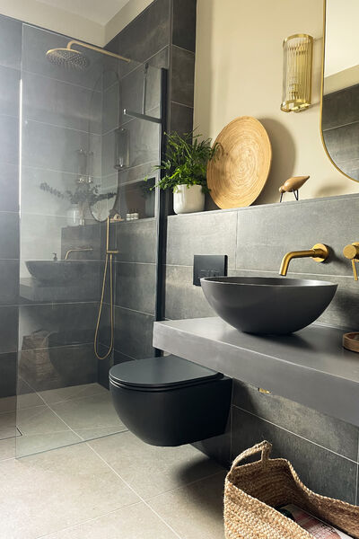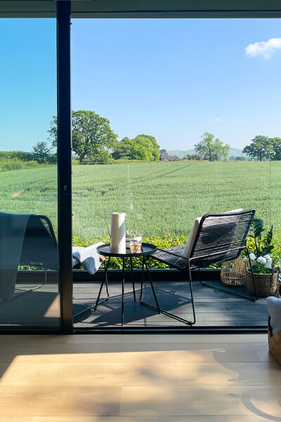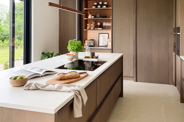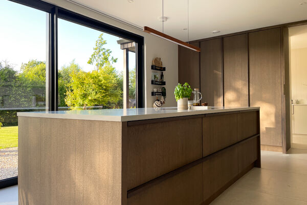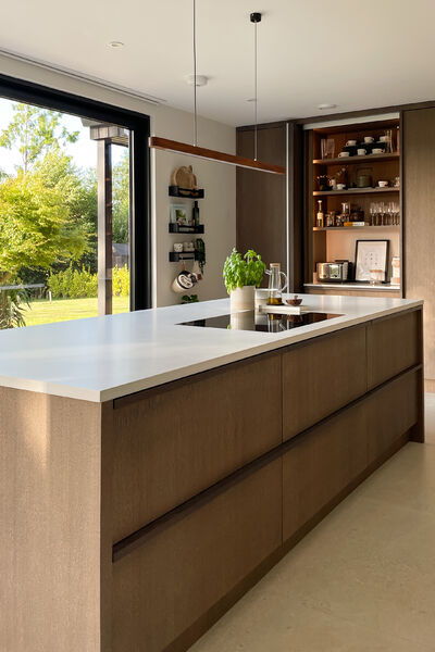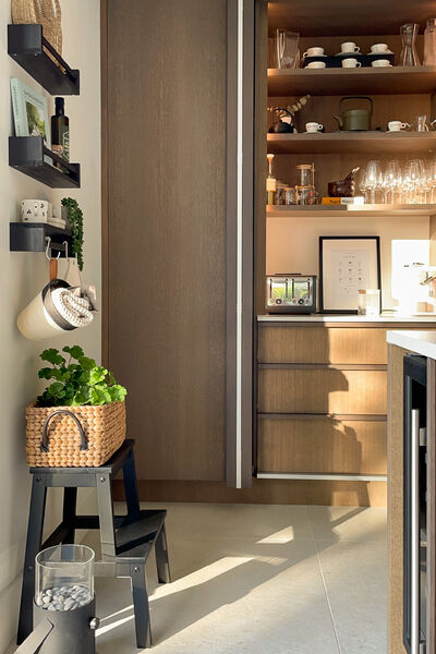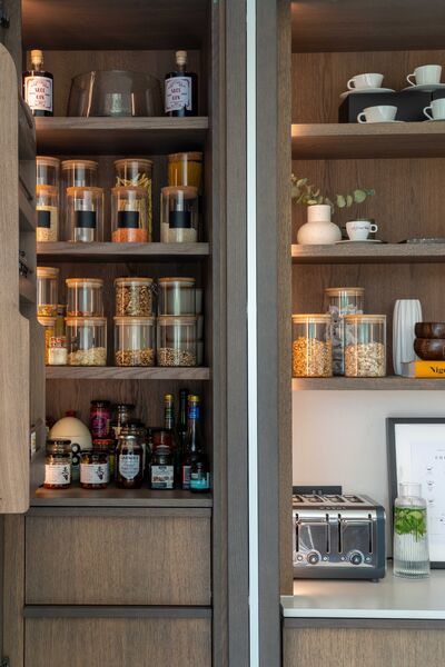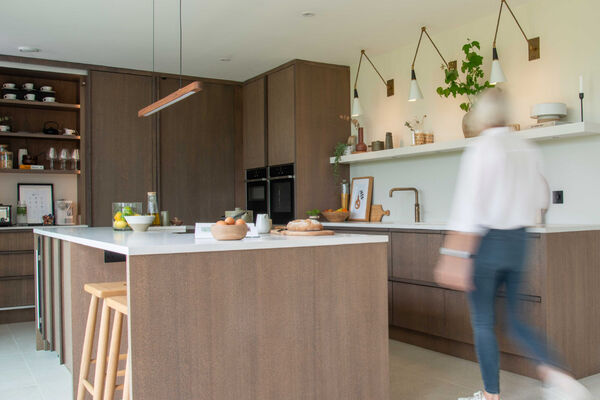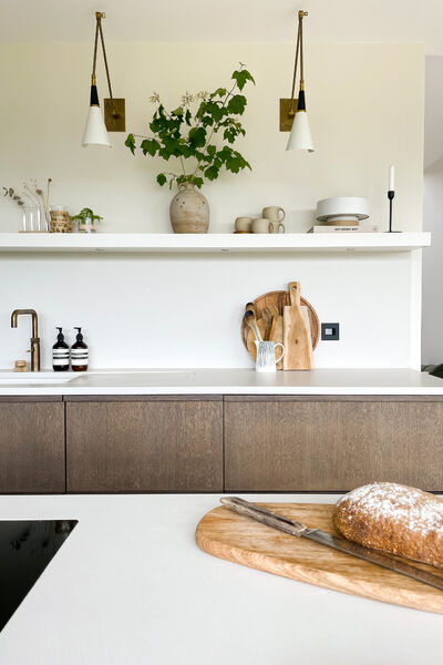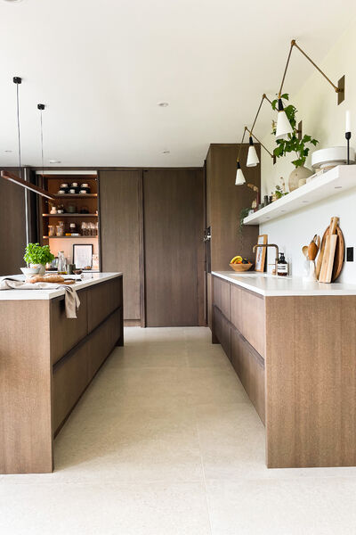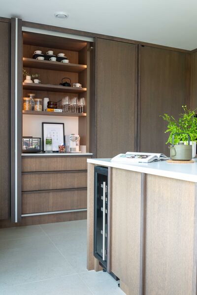 There is a modern dark wood Scandinavian inspired kitchen with a hideaway breakfast pantry and open shelving (ideal for styling), hidden door to utility.
