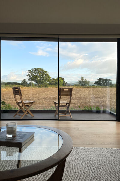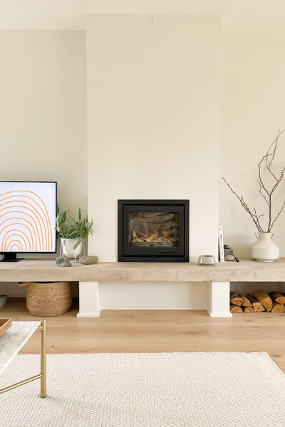 Open plan living and dining with feature concrete hearth with wood burning cassette fire.