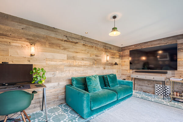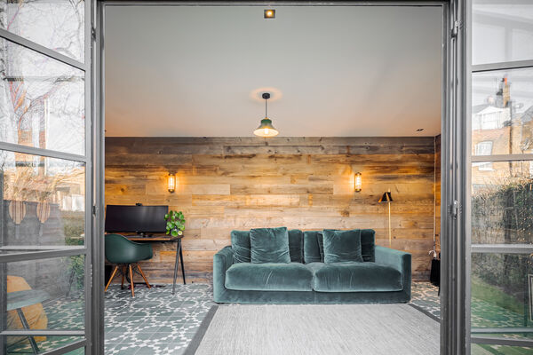 Outside is a garden room with sitting and dining space and also a large garden shed.