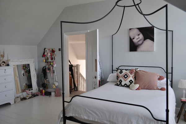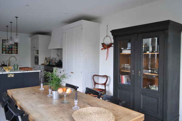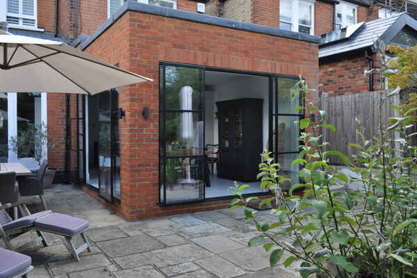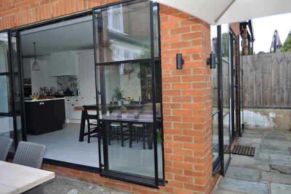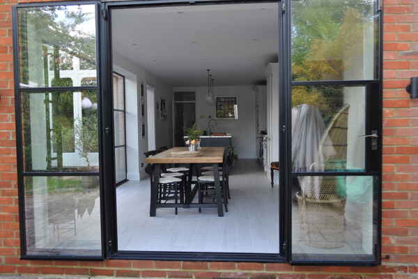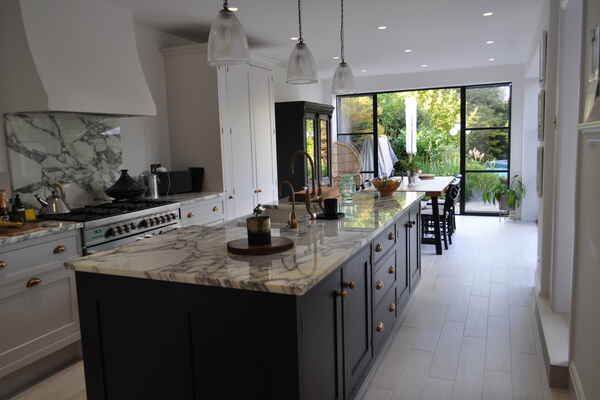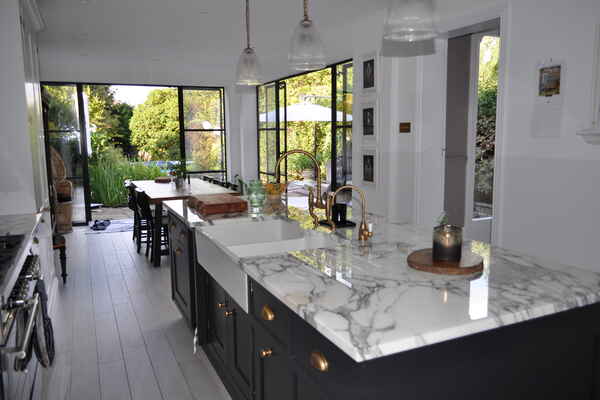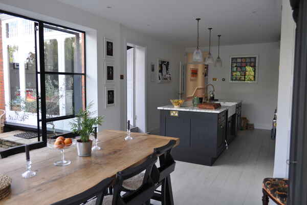 The family kitchen has a large island and double aspect crittal doors which lead through into the garden.