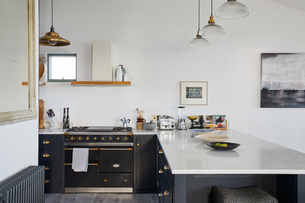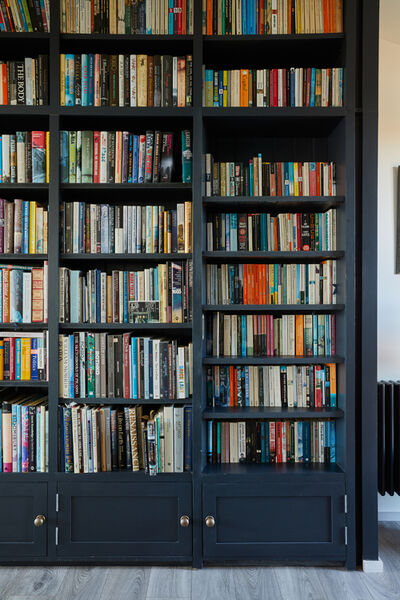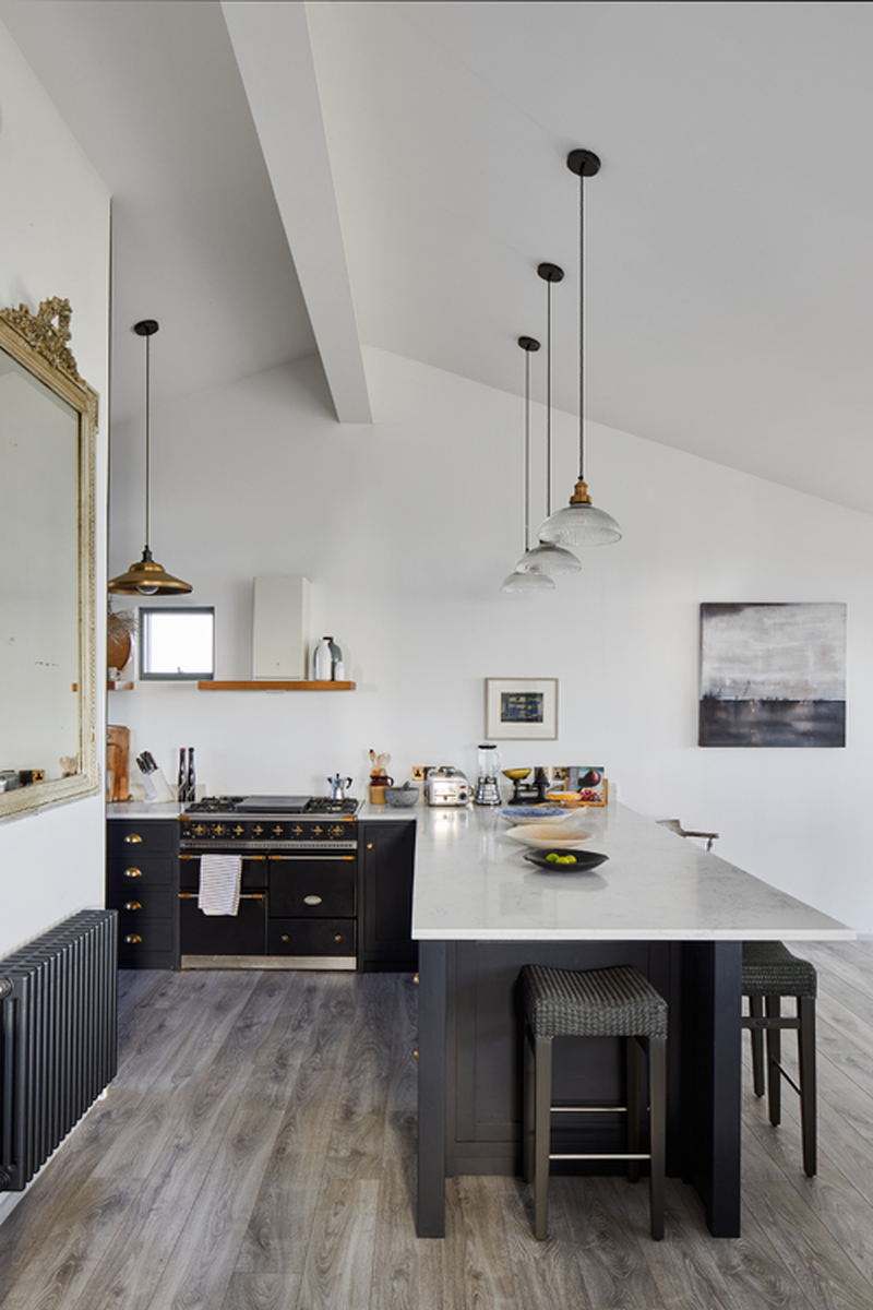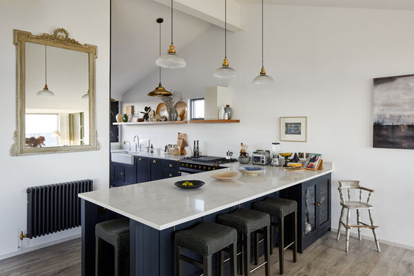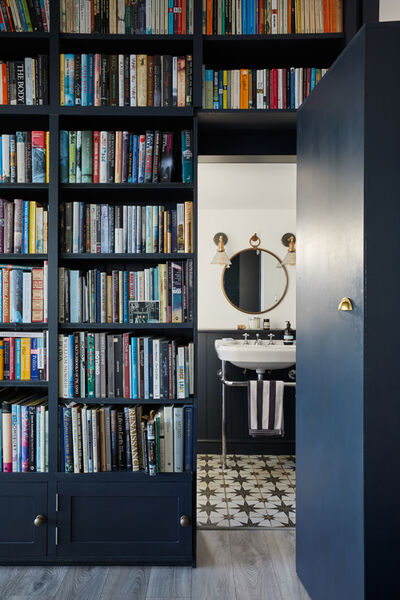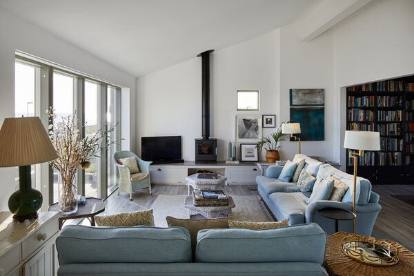 Cleverly designed, upside-down living ensures that the gorgeous open plan social spaces make the very best of the stunning sea views. Large windows frame the water at every opportunity, and draw you to the ocean beyond. Yet, unlike the exterior, which is streamlined and modern, there's a warmth and tranquillity that flows throughout. The sitting room has a peaceful palette of soft blues and neutral tones. The library, with its beautifully presented, covetable collection of books, provides another great area to shoot. If you look carefully, you’ll discover the secret bathroom, hidden behind one of the bookshelves, offering possibly the best view of any room in the house. The statement kitchen with expansive marble worktops is painted the dark blue of a stormy seascape.