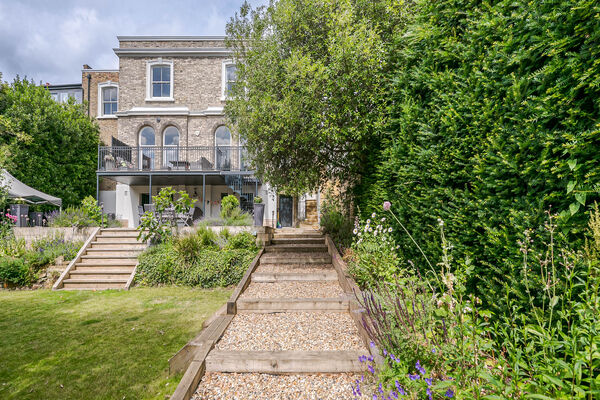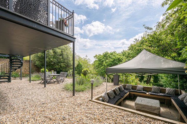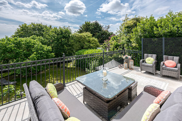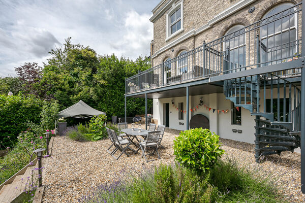 On the ground floor, the property features a spacious kitchen/dining room, a sitting room with doors opening onto a large terrace overlooking the terraced garden, a TV room with adjoining doors to the sitting room, a hallway, and two downstairs loos.