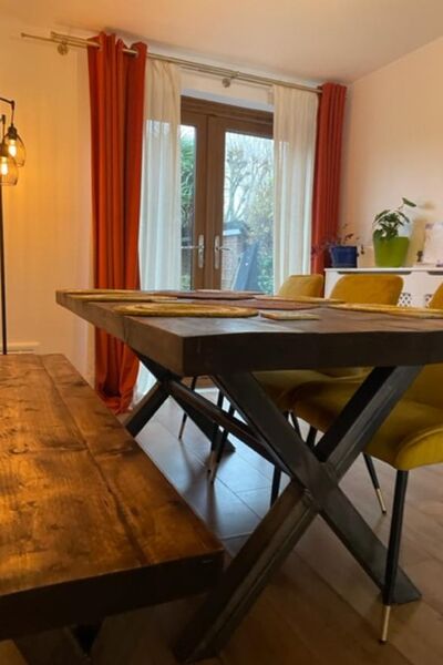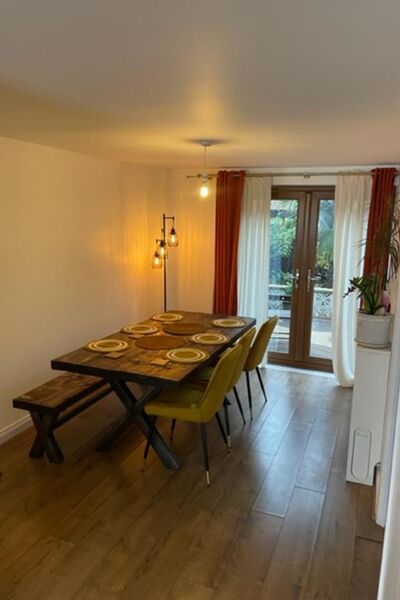 A rustic dining room with 8 seater table leads onto a fully equipped kitchen.