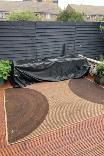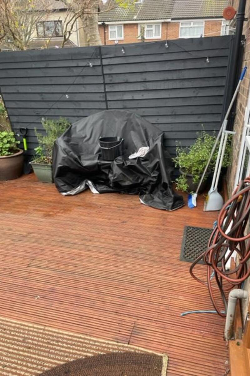 A a garage with electric wired in backs onto the garden with a large patio a shed and garden furniture for 12 people