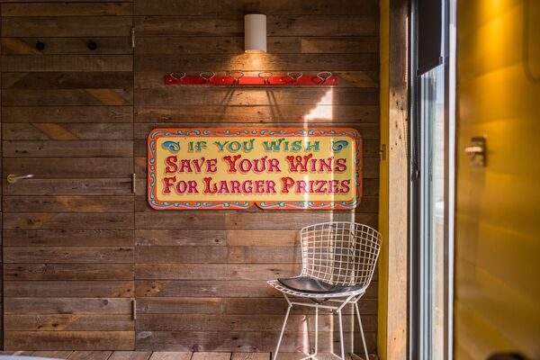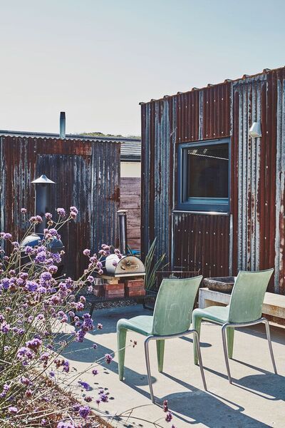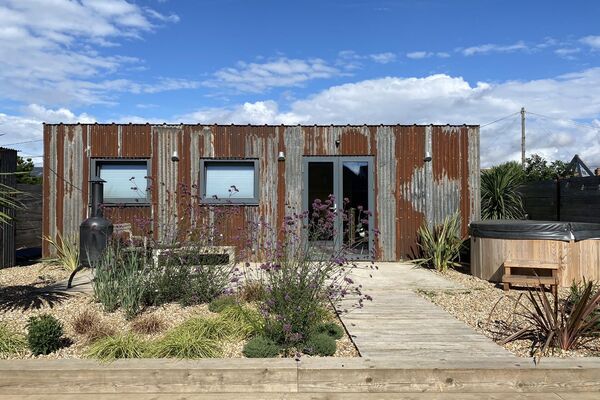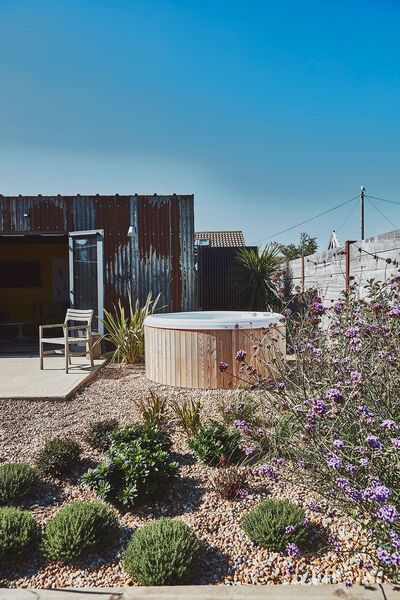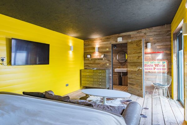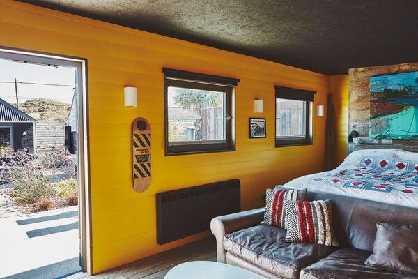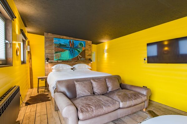 The garden room is the decorated in bright yellow and has a sofa and double bed inside.