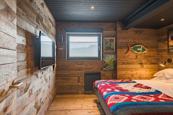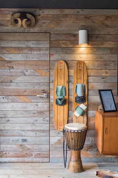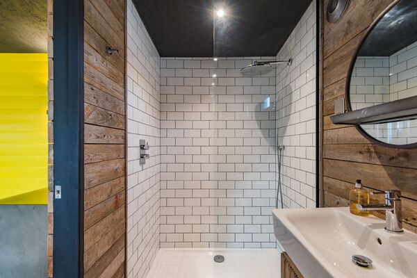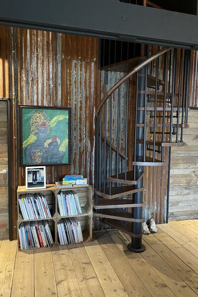 Leading up a spiral staircase is a small snug mezzaine space with lighting and floor matts.