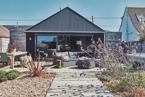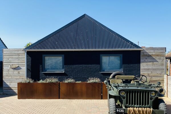 A detached single story black wooden clad house.