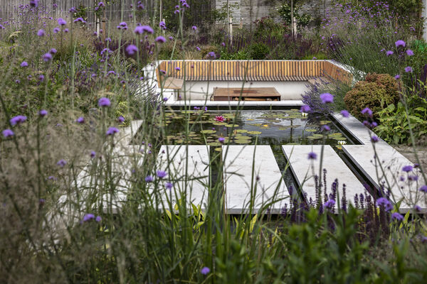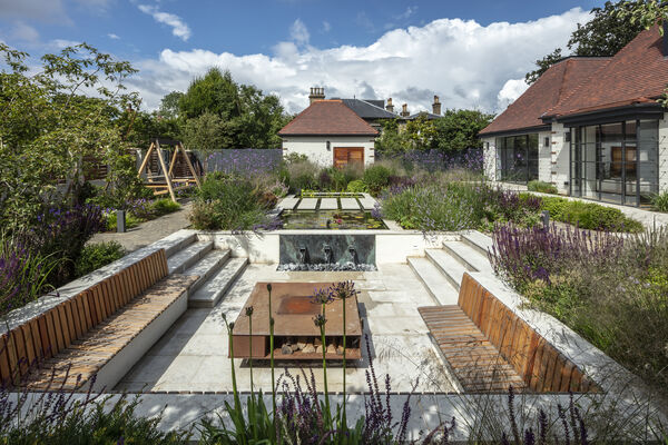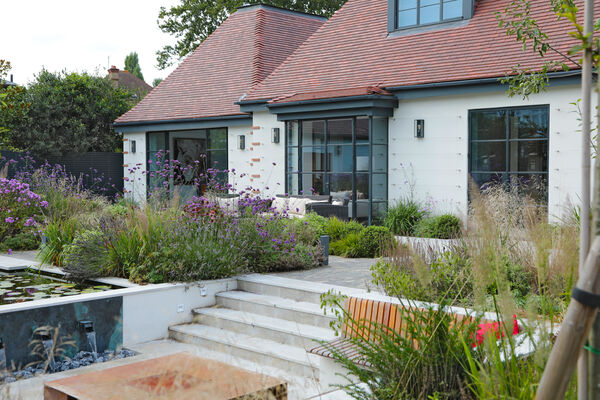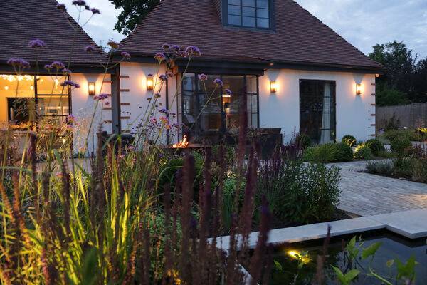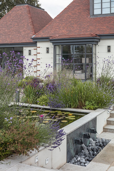 The grounds have been wonderfully curated with a slightly Japanese-inspired garden at the front of the property, with a large pond, exquisite planting, sunken seating area around the pond with a fire pit and a hand-crafted swing seat.