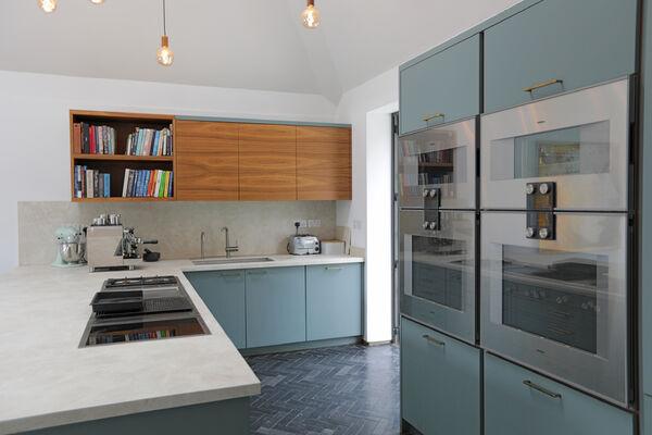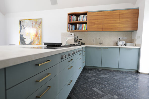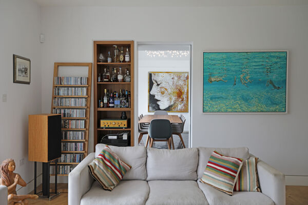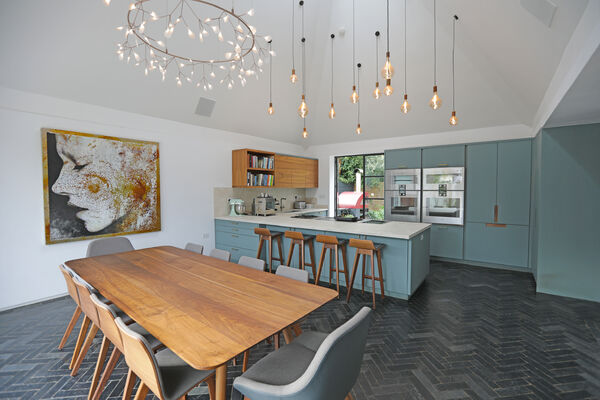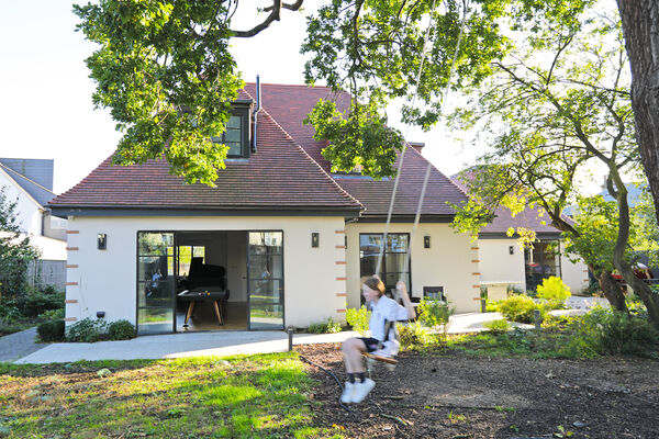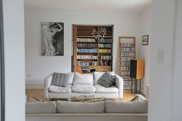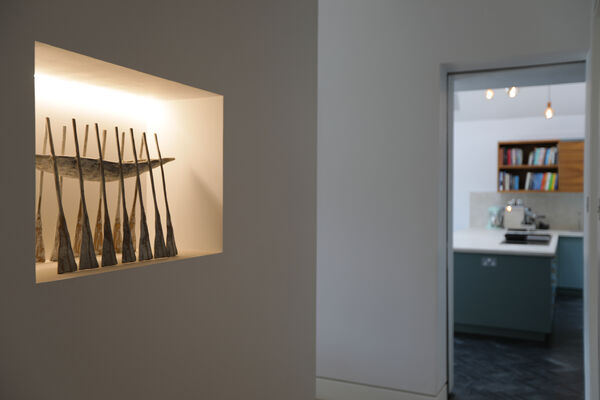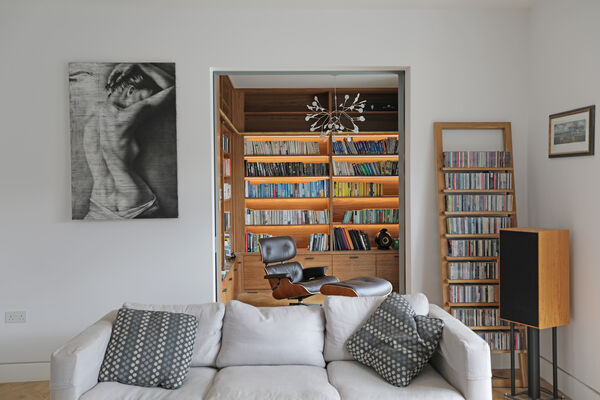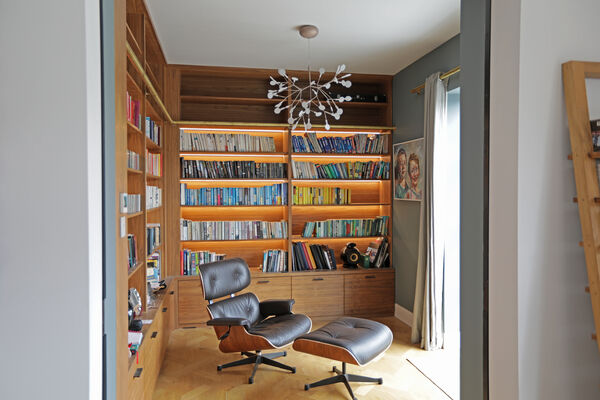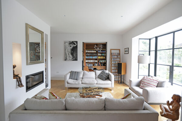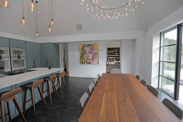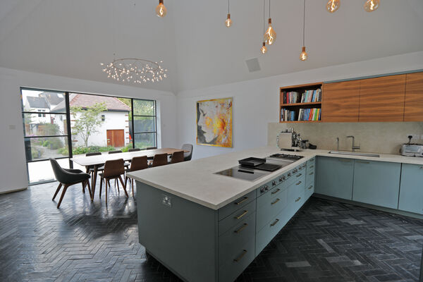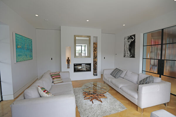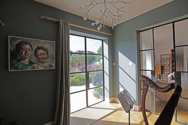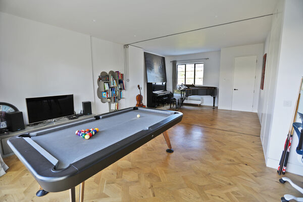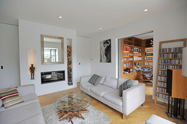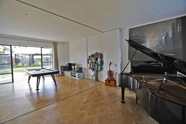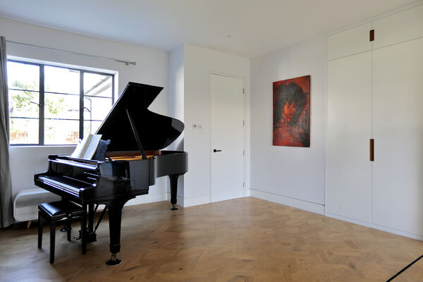 On the ground floor there is a very large playroom/music room, living room, guest bedroom, library and huge vaulted ceiling kitchen (with a 6.5m ceiling height) which is the wow-space of the ground floor.