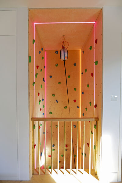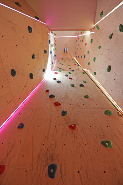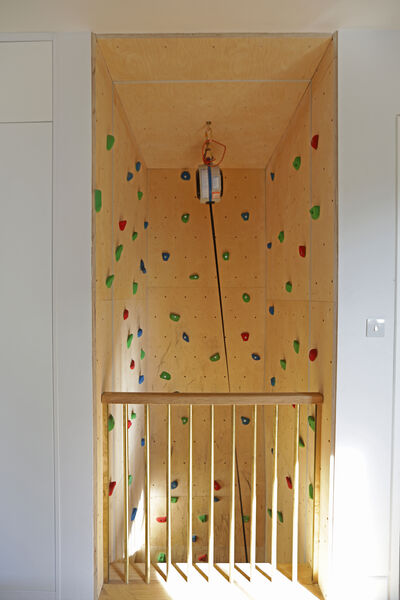 As you enter the property through the bespoke bronze patina front door, to the right is a 6.5m climbing wall!