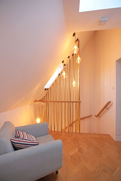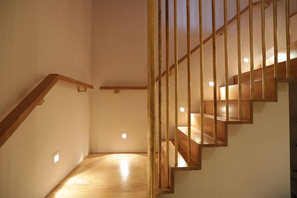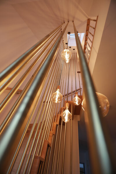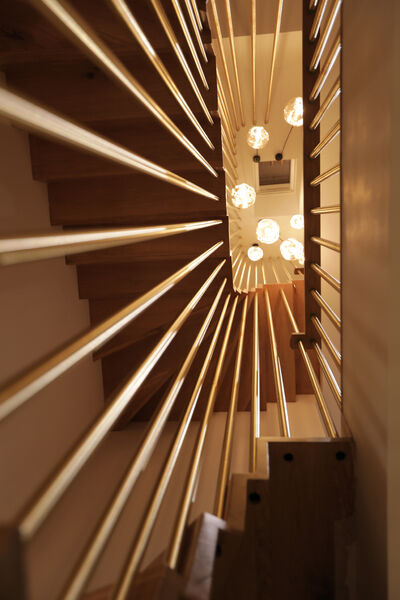 A bespoke oak and brushed brass staircase leads up and down with bespoke lighting to match.