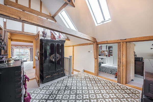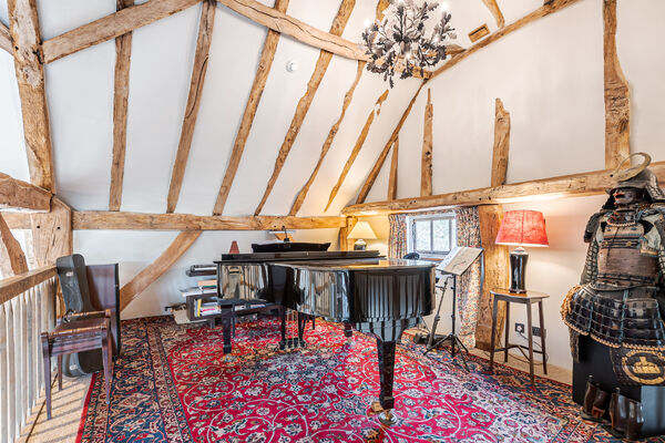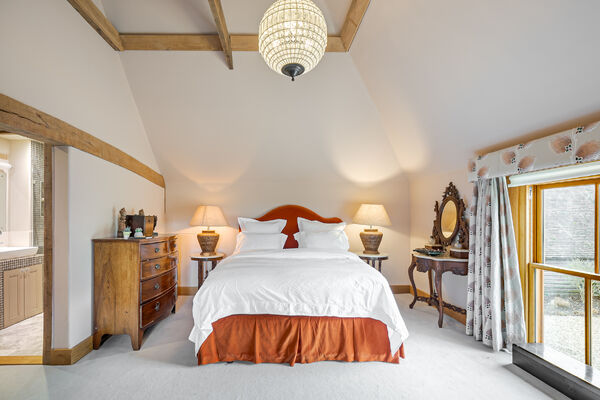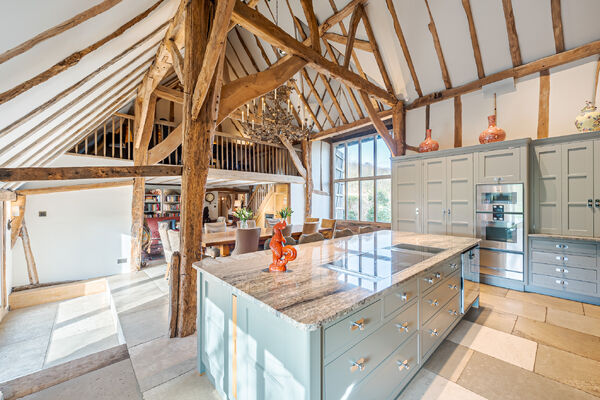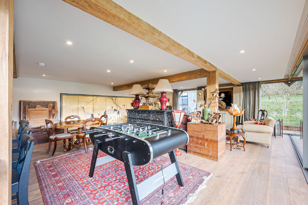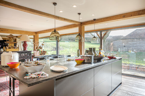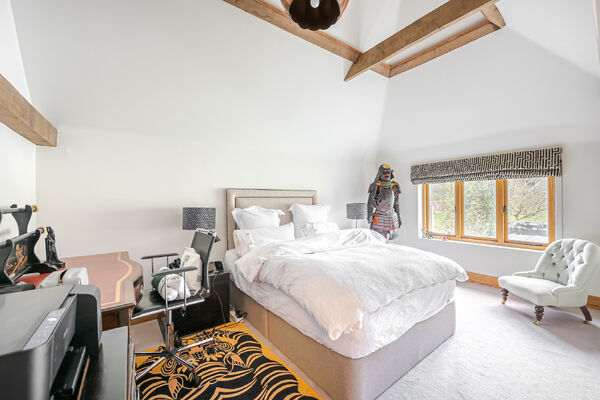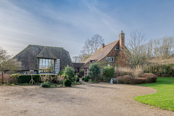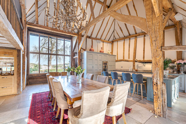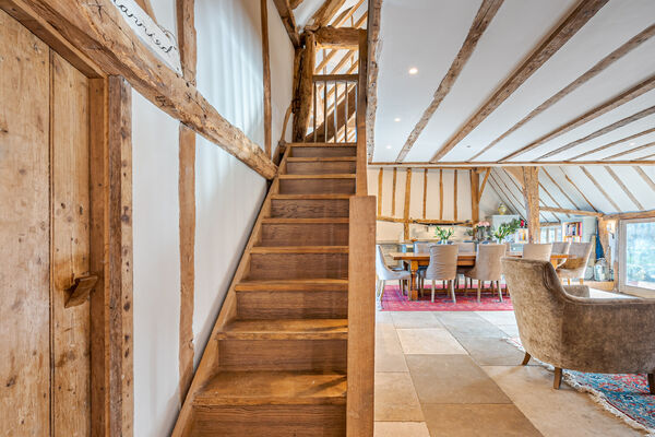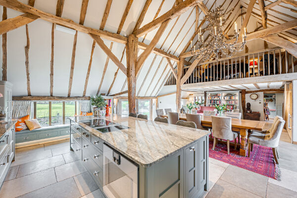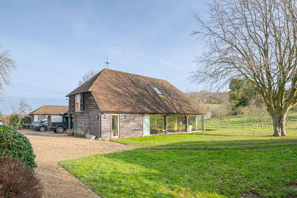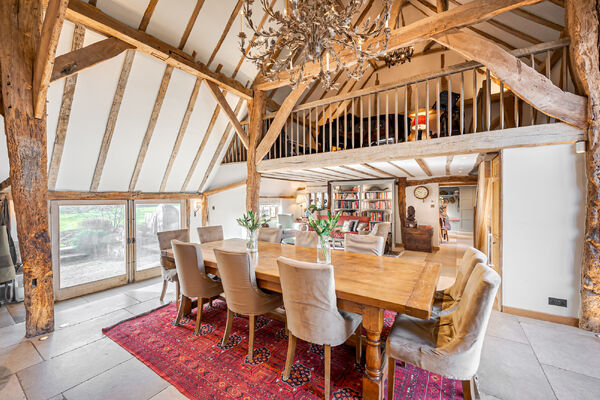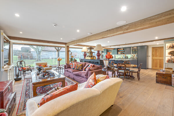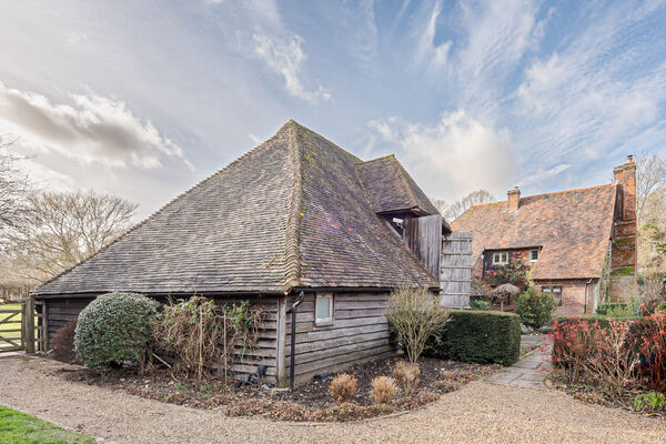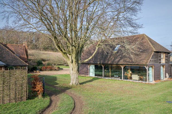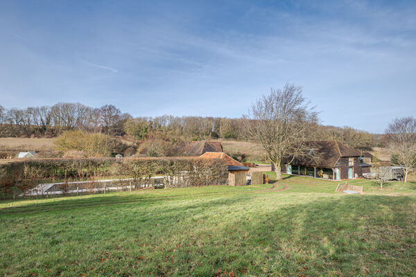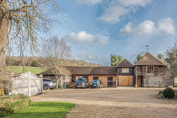 Located in the serene North Downs, this estate combines the charm of a traditional English cottage with the rustic appeal of a barn conversion. Enjoy sweeping valley views from the main house, featuring a cosy reception area with a rustic boot rack. Inside, a spacious kitchen seamlessly connects to a dining and sitting room, accented by oak beams and wooden floors. A mezzanine level adds a touch of elegance with a grand piano, while practical amenities like a separate pantry and boot room enhance functionality.