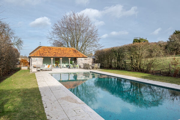 Outdoors, a tiled swimming pool surrounded by lush hedges offers a private oasis, complemented by a charming pool house for relaxation. The expansive 30-acre grounds feature amenities such as a greenhouse, shed, and space for livestock, along with a woodland area for exploration and recreation. A historic late sixteenth-century building adds character to the property, featuring exposed oak beams and a double-height ceiling. Overall, this enchanting estate provides a perfect retreat amidst the natural beauty of the North Downs.