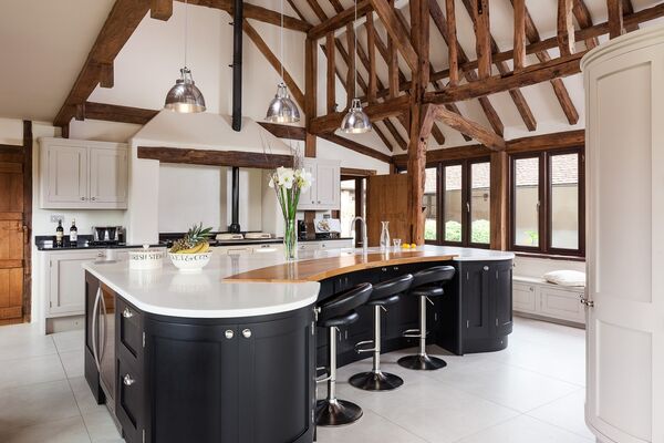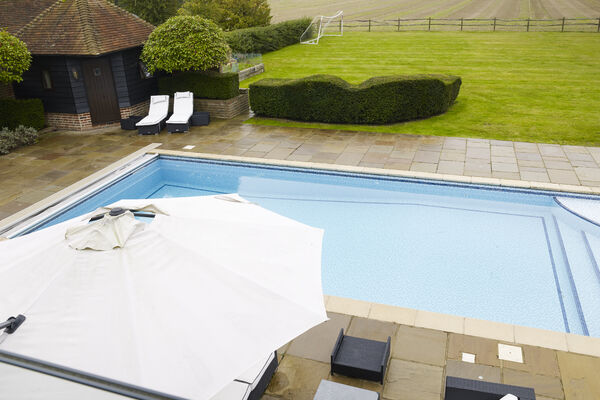 The interior boasts a stunning, large double height vaulted kitchen with large island & AGA, spacious dining area for 12 leading through bifold doors out onto the terrace and the 13 metre swimming pool.