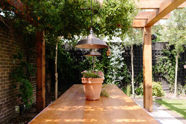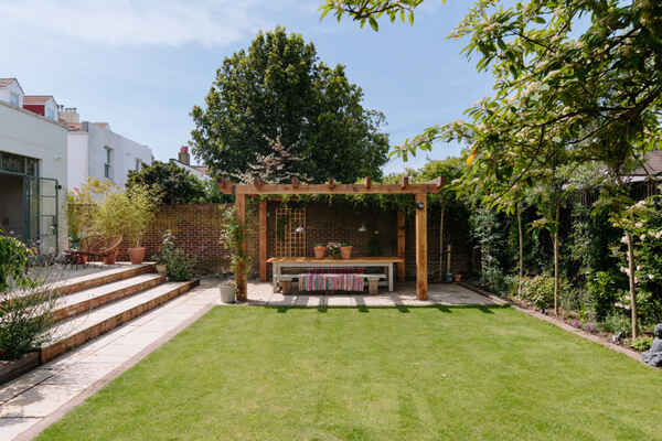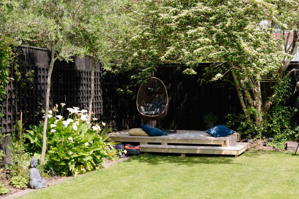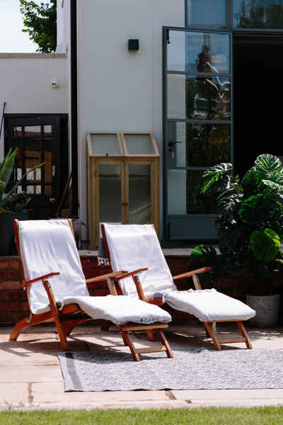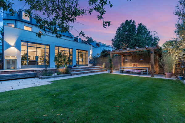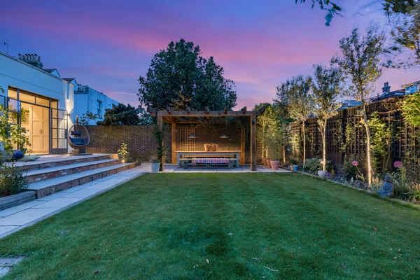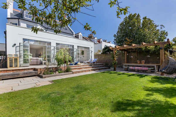 Leading out from the kitchen is a large garden which is kept minimal with lawn and patio area, a shaded seating area and further lounging seats around the garden.