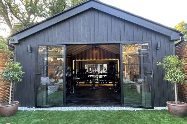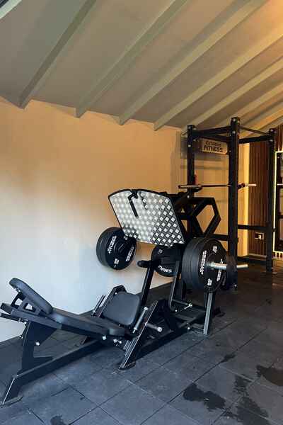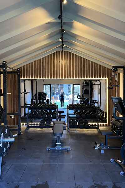 - Large gym at the end of the garden (30sqm) - fully equipped with: back-lit mirror spanning whole back wall, squat rack, dumbbells upto 40kg, dual cable pulley machine, leg press, lat pulldown/low row machine, seated leg curl/leg extension machine, Peloton bike
