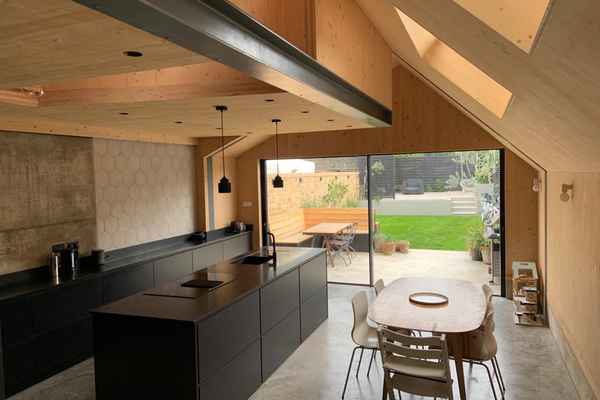 A 4 bedroom terraced home based in London. The living room picks up on design features which flow through into the kitchen which has been extended in a unique way with features such as timber, concrete and black cabinetry. The kitchen leads out into a landscaped garden which is in keeping with the black timber covered exterior of the house.