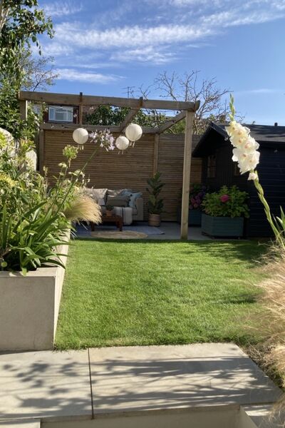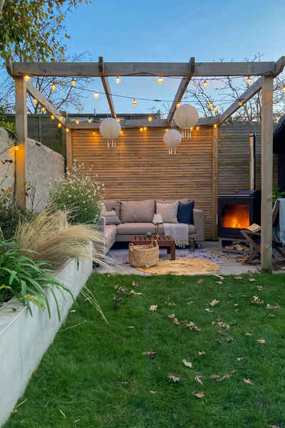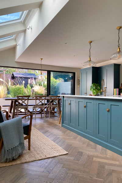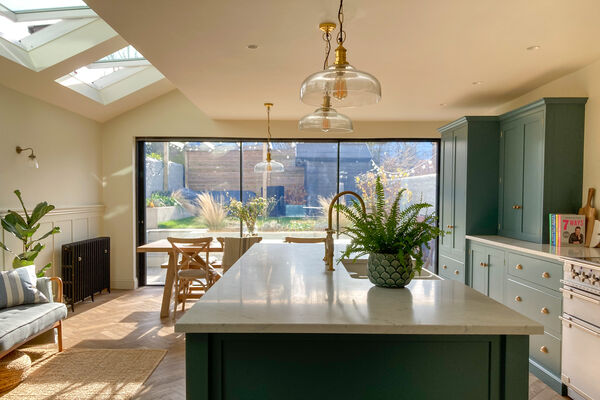 The kitchen leads out into a garden through large sliding doors.