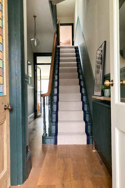 On entry is a statement staircase with carpet runner.